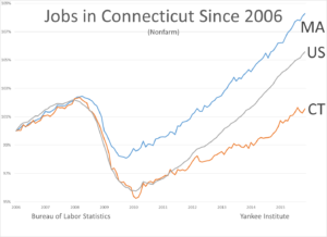 Connecticut’s job recovery closely matched the national rate of recovery from 2010 until 2011, when the state’s jobs numbers flatlined. This was the same year lawmakers voted for the largest tax increase in state history.
