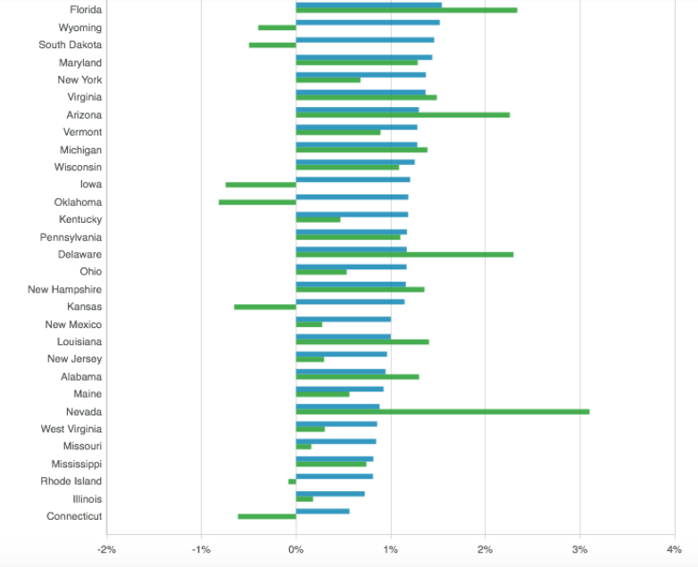 States like Texas, Utah and Colorado have high population growth rates, coupled with high personal income growth. Personal income growth in Utah grew by 2.8 percent over the past year.
