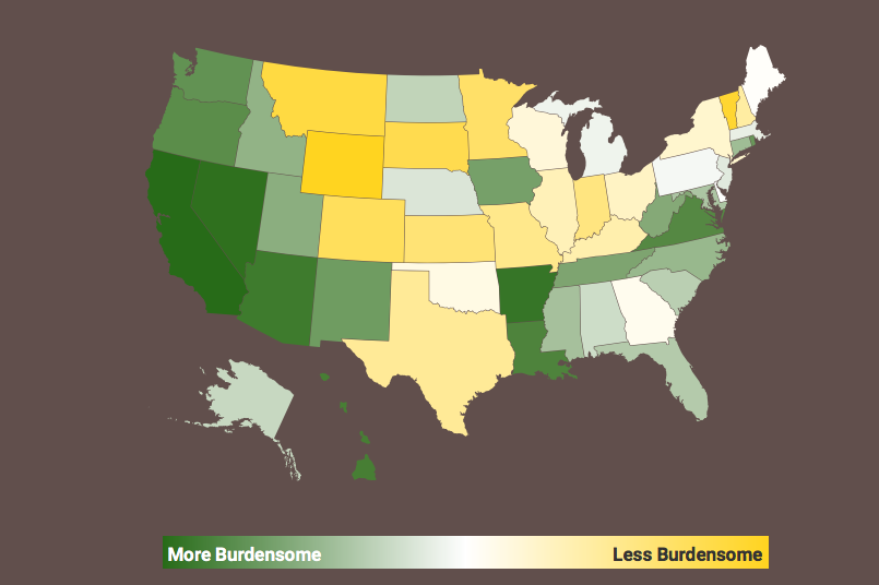 The state licensing requirements means that workers must complete state-mandated education and pay fees in order to work. The state’s requirement of a year or more education and hundreds of dollars in fees for many low-income jobs may present a barrier to job growth in a state that already has one of the slowest economies in the nation.