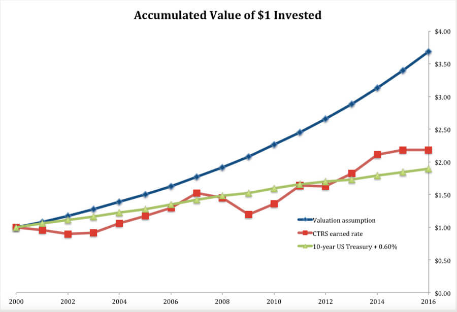 Using Connecticut’s 8 percent discount rate, the TRS is officially calculated as only 56 percent funded, with a $13 billion shortfall.