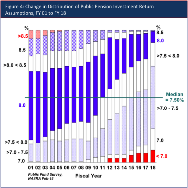 “Among the 129 plans measured, nearly three‐fourths have reduced their investment return assumption since fiscal year 2010, resulting in a decline in the average return assumption from 7.91 percent to 7.36 percent,” the report said. “If projected returns continue to decline, investment return assumptions are likely to also to continue their downward trend.”
