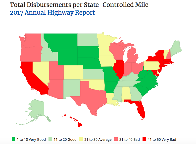 Reason’s 2016 rankings showed Connecticut spent $83,282 per mile in administrative costs and $477,875 per mile in total.