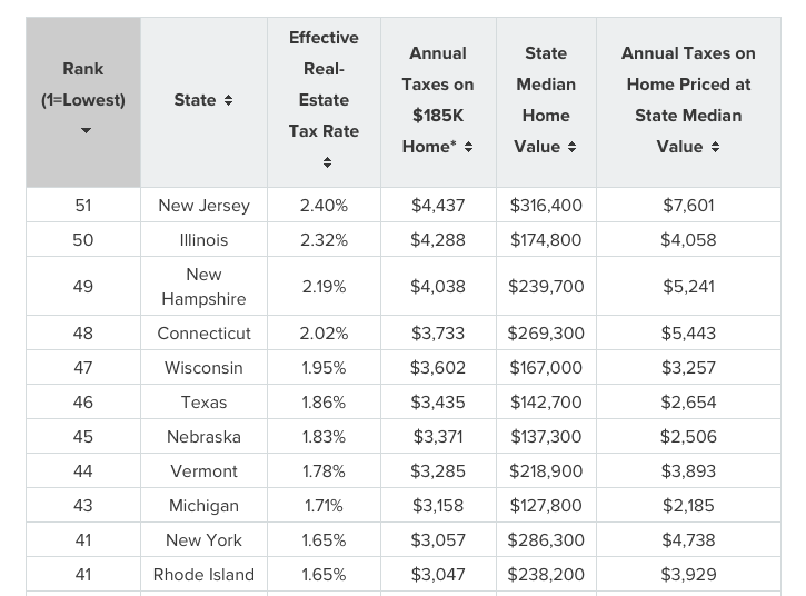 Only New Hampshire, Illinois and New Jersey had higher property taxes than Connecticut. Overall, the study found that “blue states,” which are largely clustered in the Northeast United States, tend to have higher property taxes.