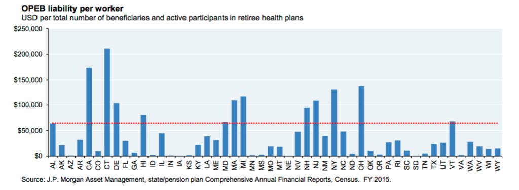 A previous report by J.P. Morgan showed Connecticut had the highest OPEB liability per state worker in the country at more than $200,000.