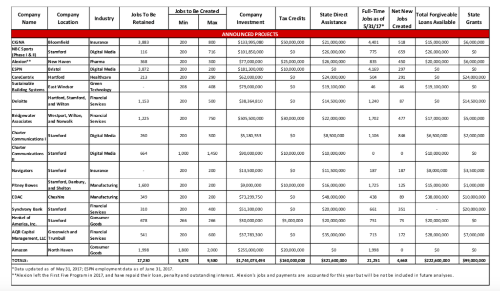 The First Five Program has provided, thus far, $321 million in direct state assistance, $160 million in tax credits, $99 million in grants to fifteen large businesses like ESPN, CIGNA, and Bridgewater Associates, according to the DECD’s 2018 First Five report.