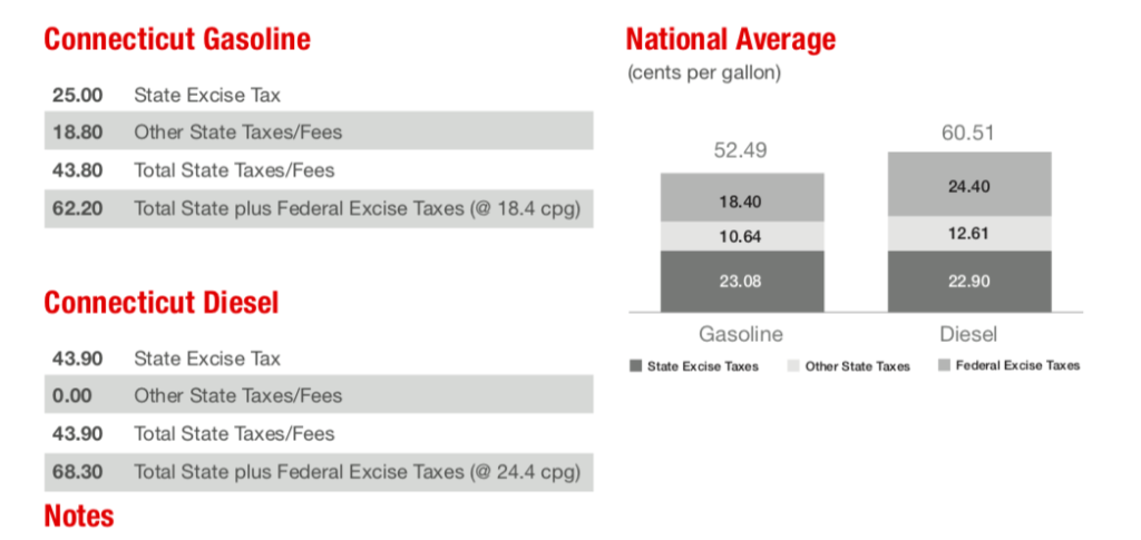 Connecticut’s excise tax for diesel is 18.9 cents higher than regular gasoline, but the state’s gross receipts tax is not assessed on diesel, according to the API.