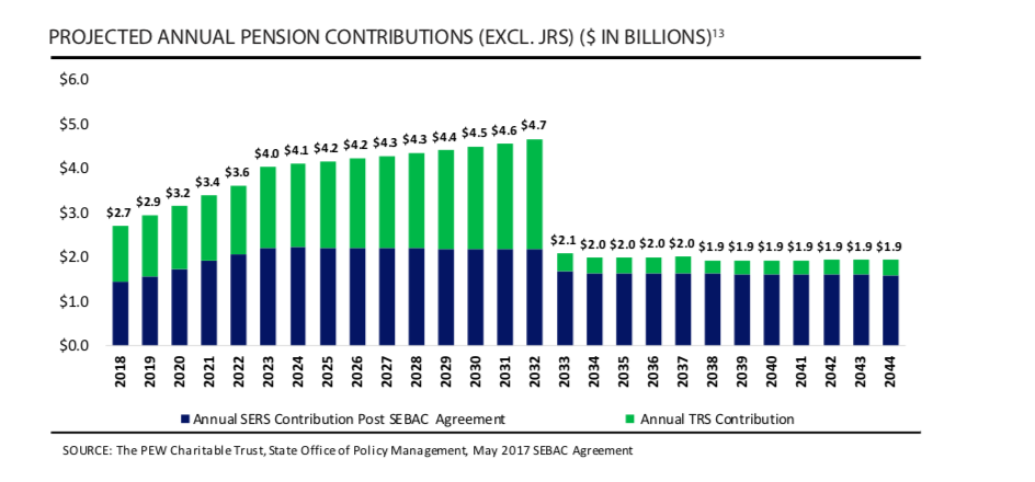 SERS payments by the state are set to grow to $2.2 billion per year in 2023 before leveling off and eventually declining back to $1.5 billion per year in 2033, after Gov. Dannel Malloy re-amortized payments in 2017.