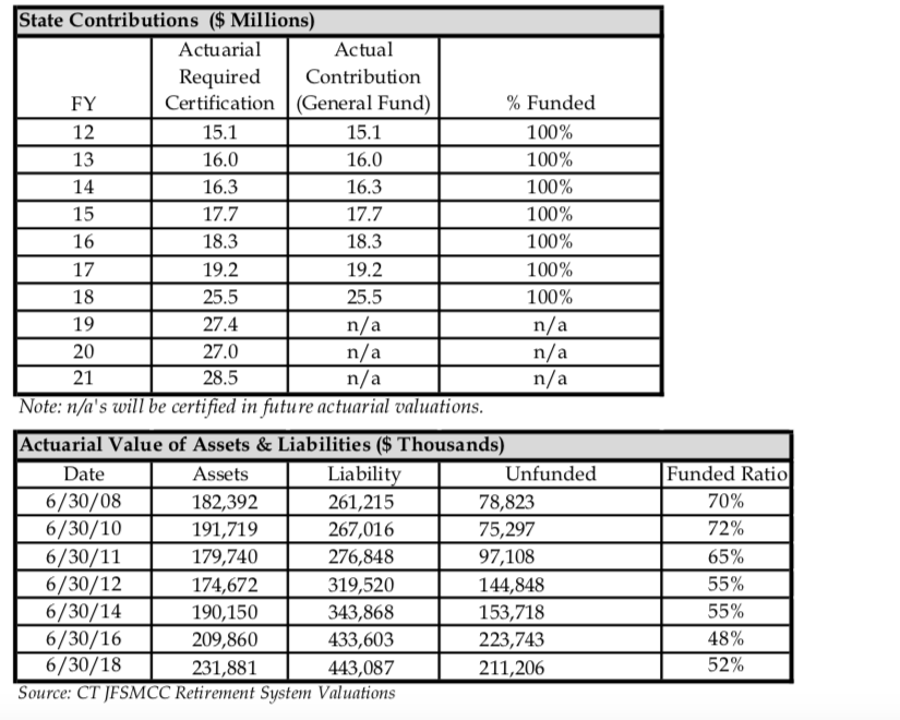 According to a fact sheet released by the Office of Fiscal Analysis, between 2012 and 2018 unfunded liabilities for the JFMCC Retirement System increased by $66.3 million to $211.2 million even as Connecticut paid the full annually required contribution toward the pensions.