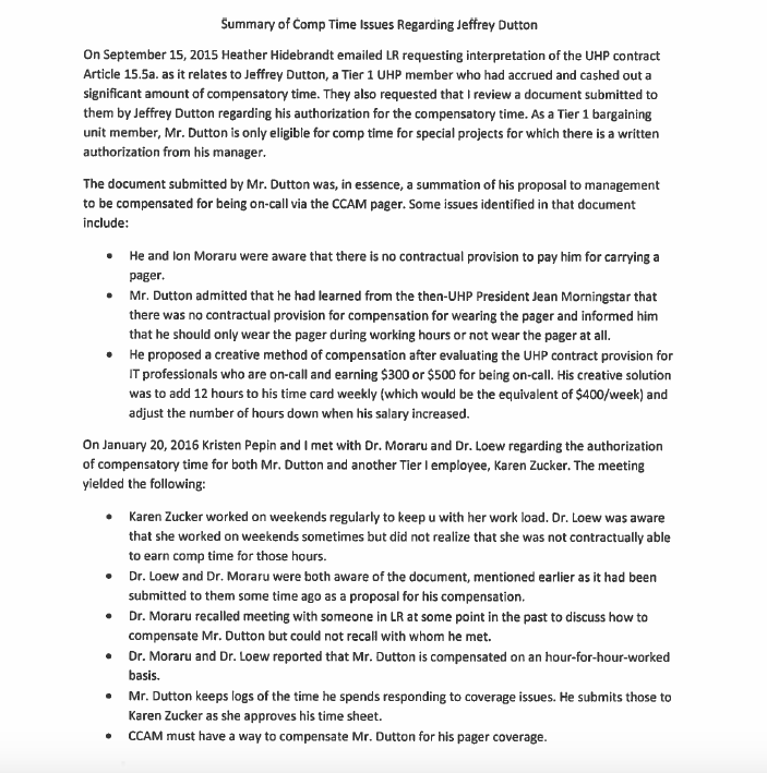 In their review of the Dutton’s written proposal, the investigators noted “Mr. Dutton admitted he had learned from then-UHP President Jean Morningstar that there was no contractual provision for compensation for wearing the pager and informed him that he should only wear the pager during work hours or not wear it at all.”
