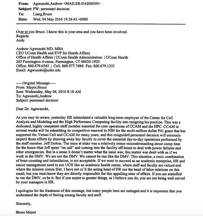 That employee was Jeff Dutton, according to emails between Professor Bruce J. Mayer, a union representative for the UConn Health chapter of the American Association of University Professors, and Agwunobi.