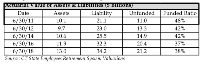Connecticut’s unfunded pension liabilities for state employees totaled $21.2 billion as of 2018, according to the state’s valuation.