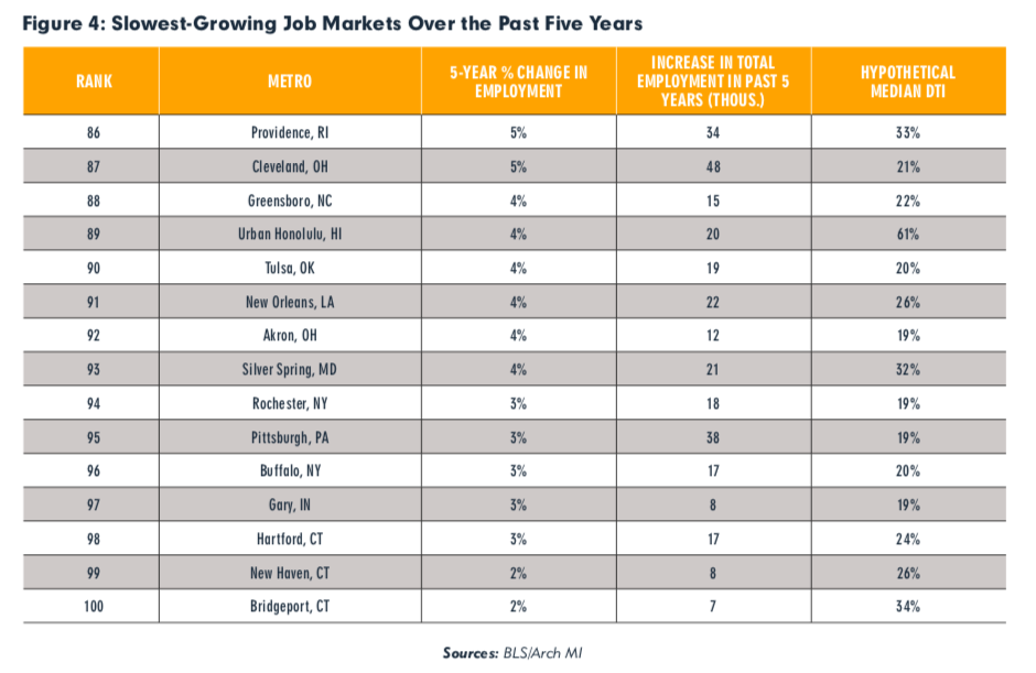 Three of Connecticut’s largest cities were listed as having the slowest job growth among the 100 largest metropolitan areas in the country in a new report by the Arch Mortgage Insurance company.