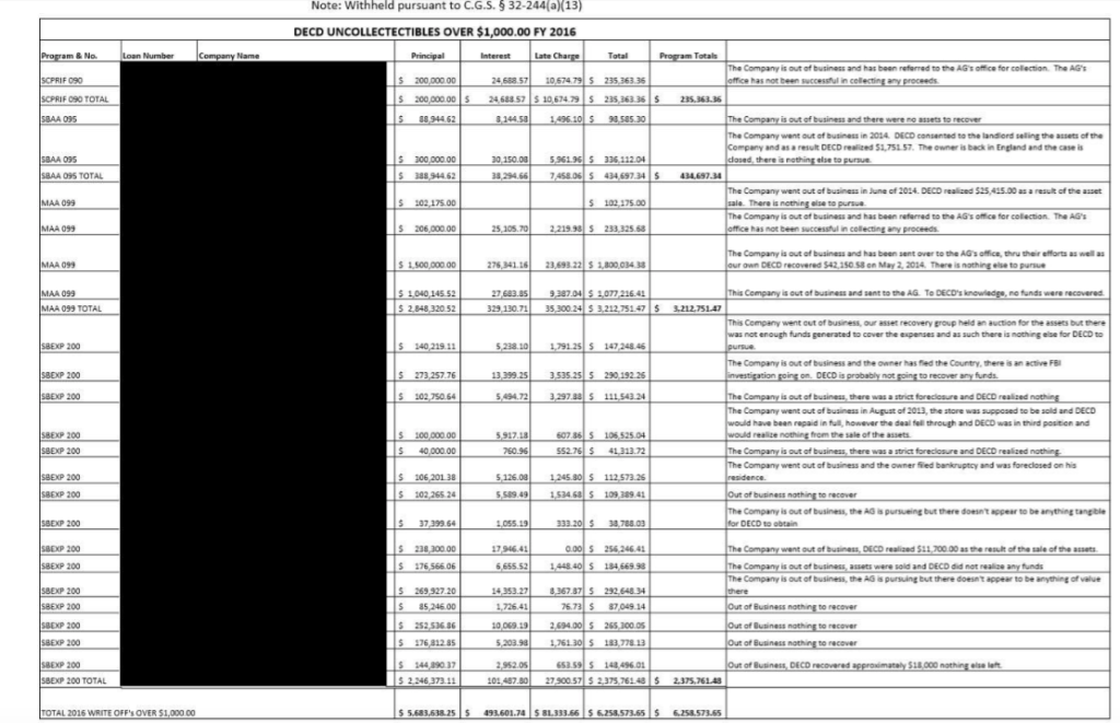 The DECD reports loan figures and status to the state’s open data website. The site currently lists $8.2 million in “written off” loans to companies that have gone out of business and an additional $1.1 million in loans to companies that have gone out of business but are not yet written off.