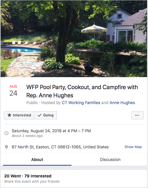 The event, posted on Facebook as the “WFP Pool Party, Cookout, and Campfire with Rep. Anne Hughes,” also listed Rep. David Michel, D-Stamford, and Sen. Will Haskell, D-Wilton, as attendees.