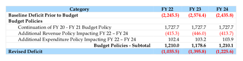 “The General Fund is projected to be in deficit by over $1 billion per fiscal year starting in FY 22 and lasting through FY 24,” the report said. “Nonetheless, policies enacted in the recent budget will improve projected out year deficits, as compared to the baseline estimates, by approximately $1.2 billion per fiscal year.”