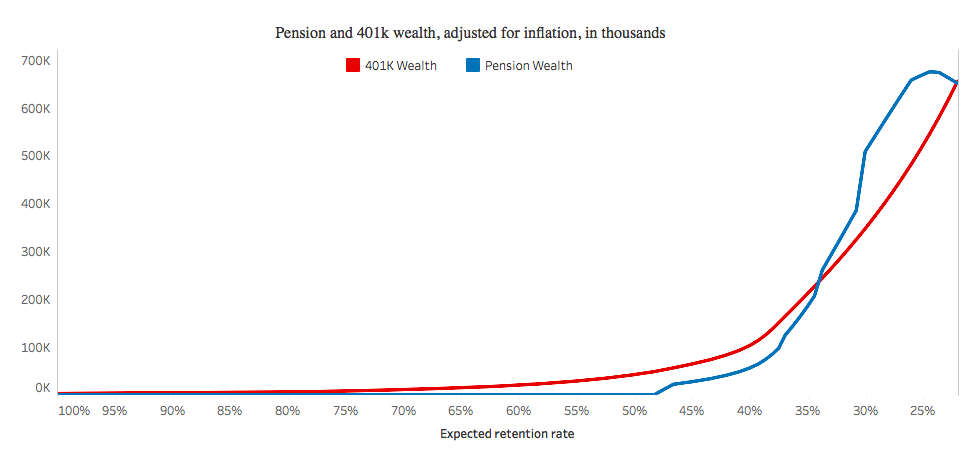 Using a hypothetical teacher in the Hartford Public School system, the calculations show the defined contribution plan would generate benefits earlier in a teacher’s career and, over the long-term, nearly match the accumulated retirement wealth under Connecticut existing pension system.