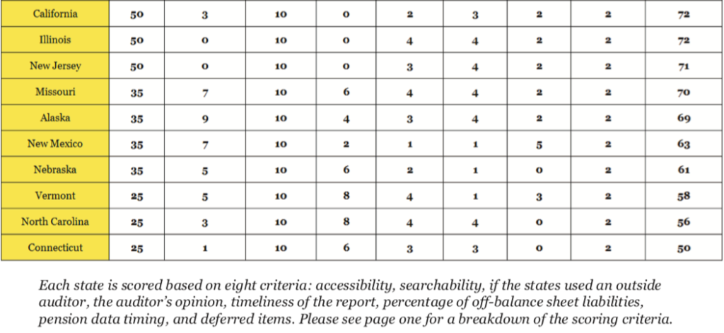 The study scored states on eight different metrics, including having an independent auditor review state financial reports, reporting all retirement liabilities without deferring them, timeliness of the reports and ease of access to those reports.