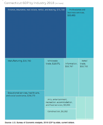 According to reports from the CT DOL, the financial, real estate and insurance sectors of Connecticut’s economy are the largest source of state gross domestic product, accounting for $77 billion in 2018.