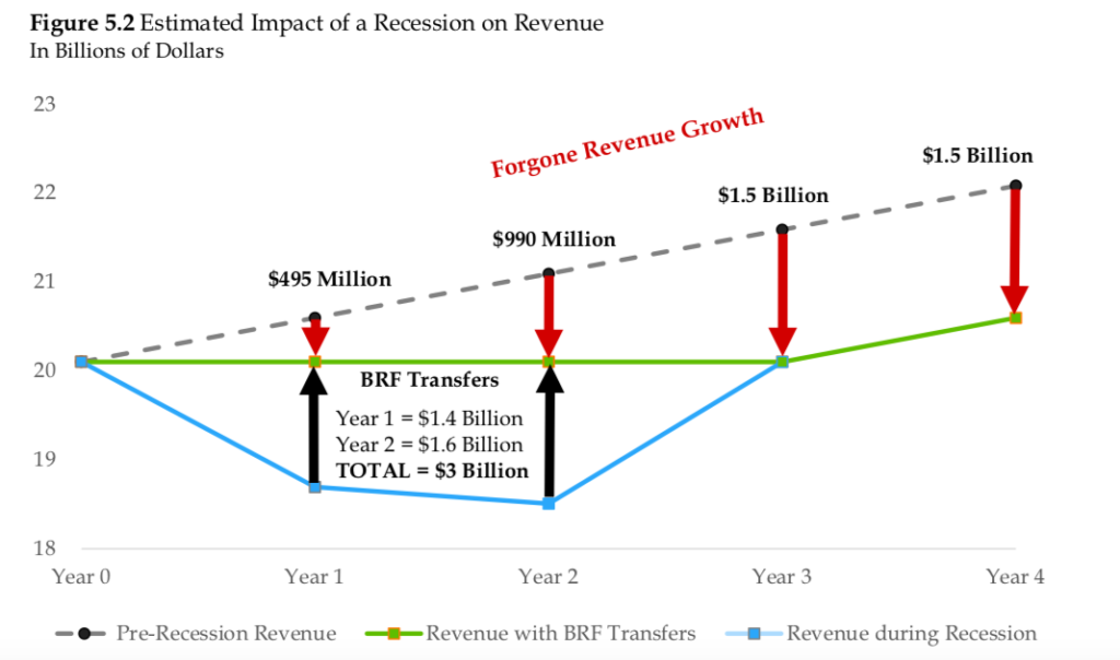 A previous report by the OFA showed how an economic downturn results in forgone revenue, while expenditures continue to increase creating a large, on-going gap. This raises the question of tax increases or large cuts to government services in the future.