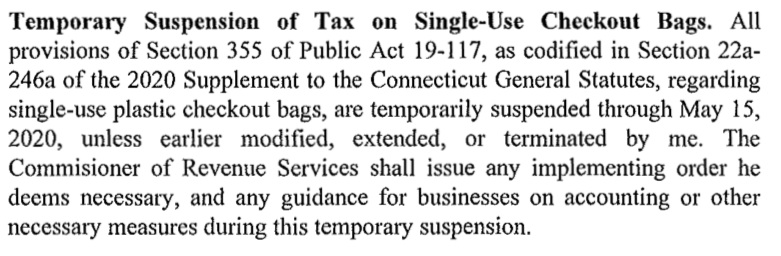 Lamont’s original executive order issued on March 26 temporarily suspended the tax in response to the COVID-19 pandemic until May 15 and said grocery stores could not require employees to bag groceries in reusable bags.