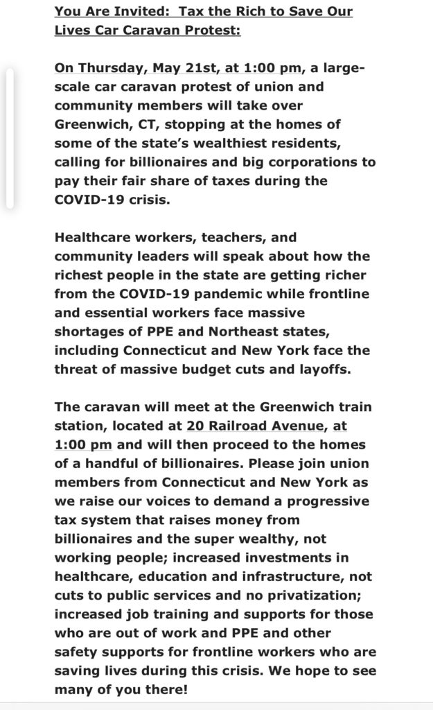 “Please join union members from Connecticut and New York as we raise our voices to demand a progressive tax system that raises money from billionaires and the super-wealthy, not working people; increased investments in healthcare, education and infrastructure, not cuts to public services and no privatization,” the notice reads.
