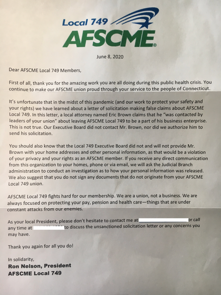 In a June 8 letter to their 1,500 members who work in Connecticut’s judicial system, AFSCME Local 749 President Ron Nelson warned of an effort to lure members away from AFSCME to a new union.