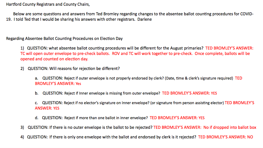 In an email dated August 6, Bromley provided short answers to questions from town clerks and registrars as to under what circumstances an absentee ballot was to be rejected.