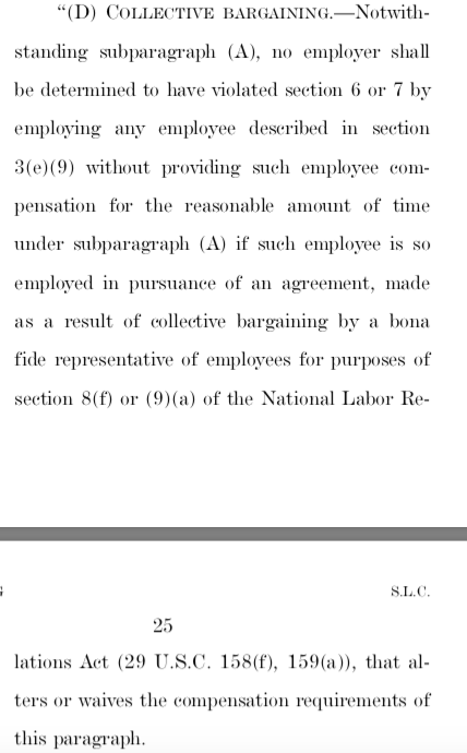 Specifically, the bill states that no employer shall be deemed to have violated Section 6 or 7 of the Fair Labor Standards Act if the employees are covered under a collective bargaining agreement negotiated by recognized labor representatives.