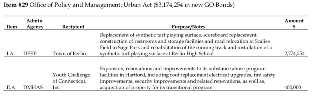 The total $3.1 million bond request from the Office of Policy and Management under the Urban Act specifies $2.7 million for the field at Sage Park in Berlin and $400,000 for expansions, renovations and improvements for substance abuse facilities in Hartford.