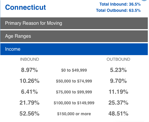 Previous years’ data from the Internal Revenue Service has shown Connecticut tends to see a net loss of high income earners who have the resources to be highly mobile.
