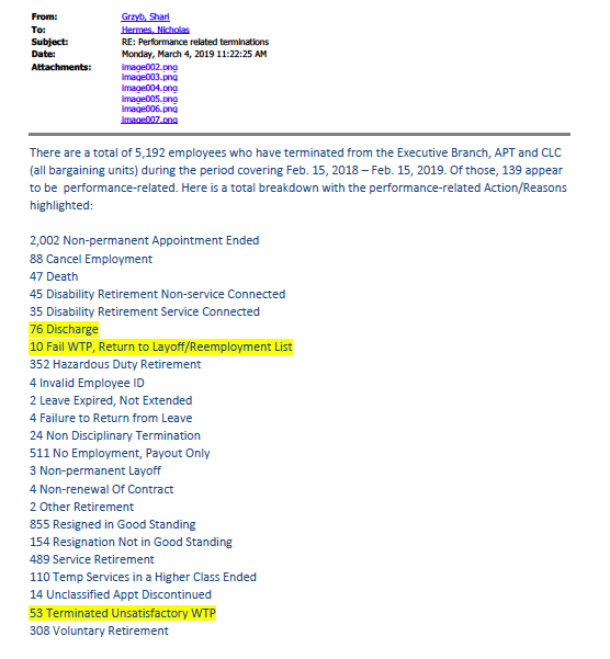 Out of roughly 30,000 state employees in the executive branch only 139 were discharged for work performance issues over the course of a year, according to figures revealed through a Freedom of Information Request.