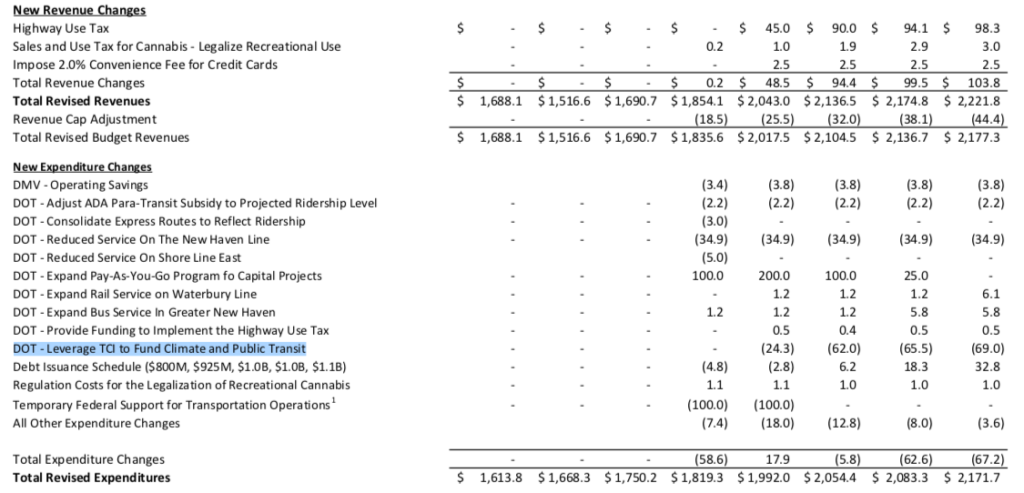 Starting in 2023, Lamont’s budget shows an expenditure reduction of $24.3 million, growing to $69 million by 2026. There are no listed revenue changes in the STF from the inclusion of TCI funds.