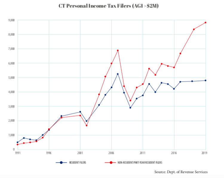 But Connecticut’s rising income tax rates have resulted in a massive shift in non-resident tax filers who earn more than $2 million per year, according to data from Connecticut Department of Revenue Services cited in the study.