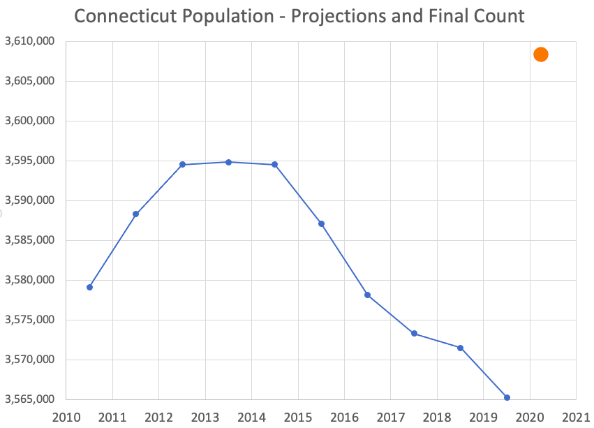 On the other hand, it’s possible the 2020 census figure is closer to Connecticut’s actual population than the intra-decade projections. The tools behind those projections play a big role in public policy matters ranging from housing to unemployment statistics—and it would mean that Connecticut policymakers have for years been getting inaccurate reads on important issues.