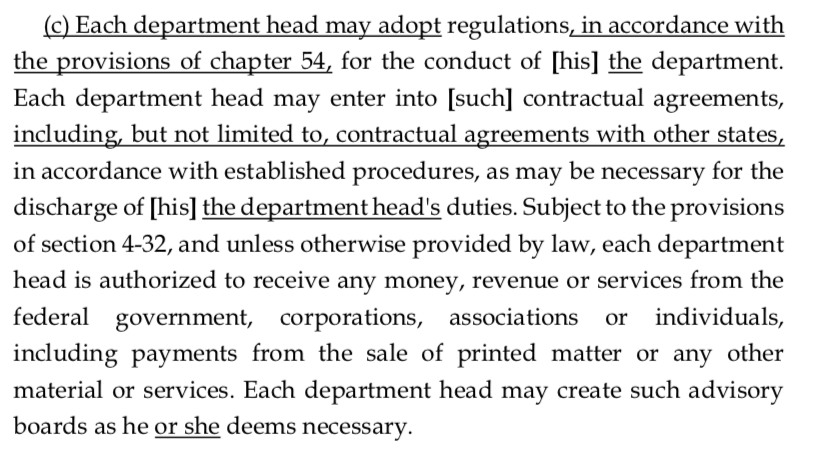 Section 221 expands existing state law by allowing department commissioners to unilaterally enter into contracts with other states. While the broad language could apply to almost anything, including purchasing agreements between states, some worry the provision could, in theory, be used to enter into TCI’s regional cap and trade system.
