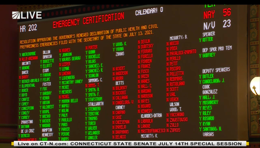 “I don’t believe we are in a state of emergency such that the governor should have these extraordinary powers,” said House Republican Leader Vincent Candelora, R-North Branford. “I think that we are setting such a low bar today with a ‘yes’ vote, in allowing a delegation of legislative authority to this governor. I have more faith in democracy than to just abdicate our authority this quickly.”