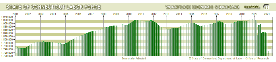 There was also a steep drop off in Connecticut’s reported labor force, which declined from 1.918 million workers as of February 2020 to 1.77 million as of June 2021, meaning that nearly 200,000 workers are either not looking for employment, have retired or left the state and are not counted toward the unemployment rate.