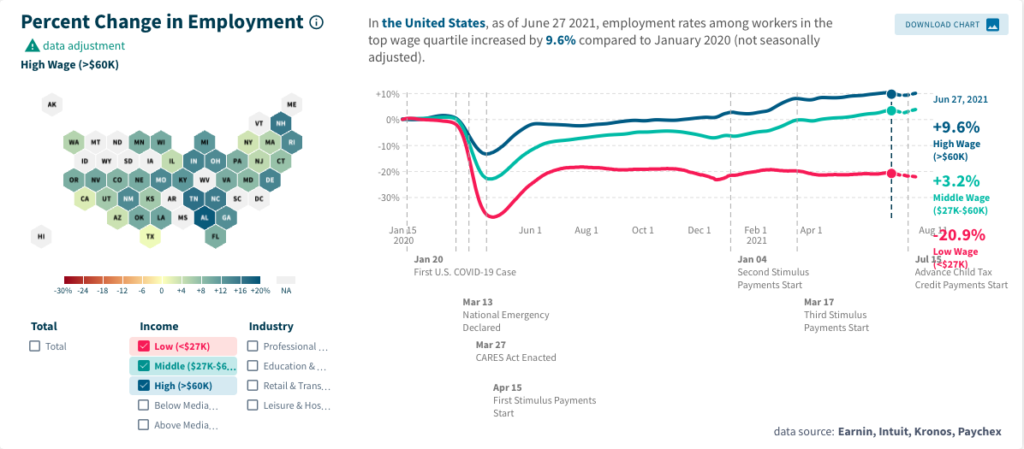 The causes of the slow recovery among lower wage workers debatable and explanations range from extended federal unemployment benefits in some states to fear of a resurgence of COVID and workers being reluctant to return to low wage jobs without seeing a significant increase in pay.