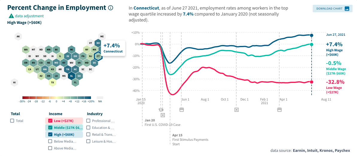 But the trend among workers on the lower end of the wage spectrum – those most affected by the COVID-19 shutdown of businesses – point to an uneven recovery that remains especially pronounced in Connecticut.