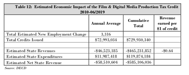 With the state awarding nearly $1 billion over ten years through its three television and film tax credits, the economic results are mixed, at best, and the DECD’s own reports find the credits have been a $772.8 million net loss for the state.