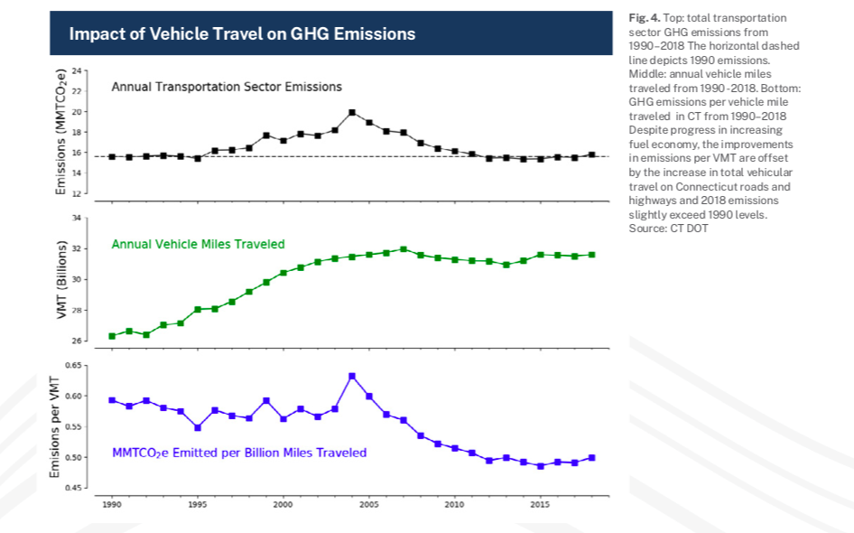However, the issue is not vehicle fuel efficiency. The report notes that Connecticut residents are driving more fuel-efficient vehicles. The problem is they are having to drive greater distances resulting in an increase in overall emissions.