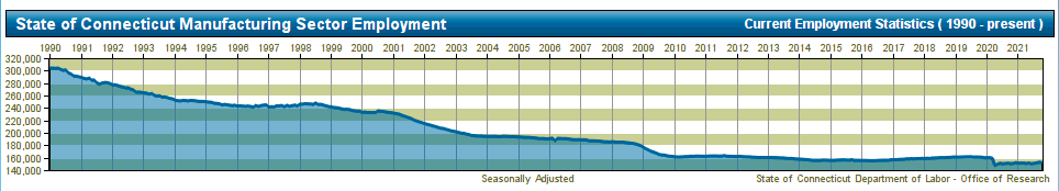 Since the establishment of CCAT in 2004, Connecticut’s manufacturing industry has hobbled along, with employers saying they lack suitable employees. Employment in Connecticut’s manufacturing sector has continued a downward slide since 1990, declining from roughly 300,000 jobs in 1990 to 153,000 in the most recent employment numbers from the Connecticut Department of Labor.