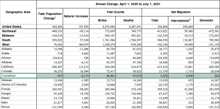 However, when measured over a twelve-month period from July of 2020 to July of 2021, Connecticut saw a population increase of 5,337, with domestic migration outpacing international migration and the influx of new residents surpassing the net loss of 4,975 people due to deaths.