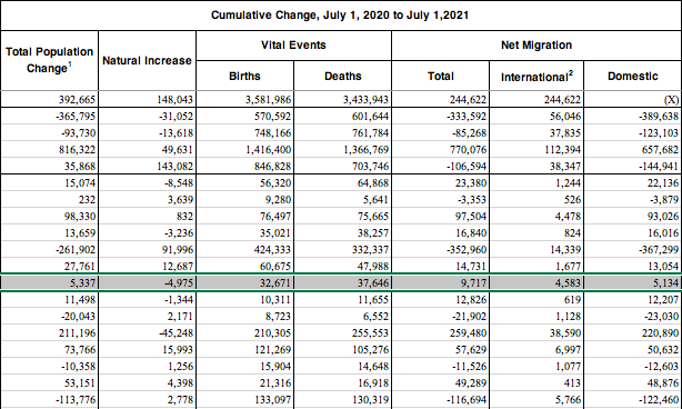 Net migration into the state during that period was 5,222, with almost all of that coming from international migration and being offset by 6,113 more deaths than births, known as the “natural increase.”