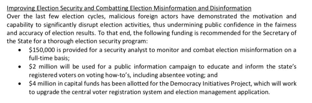 “Over the last few election cycles, malicious foreign actors have demonstrated the motivation and capability to significantly disrupt election activities, thus undermining public confidence in the fairness and accuracy of election results,” the budget reads.
