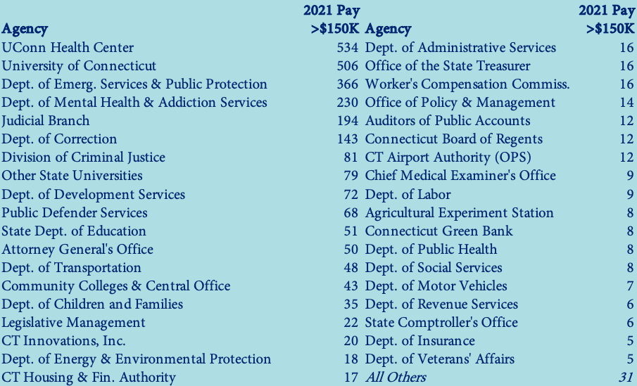 About one-third of the state’s $150,000 paychecks went to UConn or UConn Health Center employees, where the pay for faculty and most other non-appointed professional positions is subject to state collective bargaining rules.