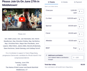 Sen. Matt Lesser (D-9th), who represents Cromwell, Middletown, Newington, Rocky Hill and Wethersfield, will be hosting a fundraiser at his home for Rhode Island Congressional Candidate Aaron Regunberg. Sen. Lesser will be joined by fellow General Assembly members Sen. Jan Hochadel (D-13th), Sen. Norm Needleman (D-33rd), Rep. Brandon Chafee (D-33rd), Rep. Christine Palm (D-36th), as well as WFP leadership among others.