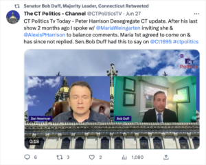 In a June 12 interview with Dan Newmyer of CT Politics TV, Senate Majority Leader Bob Duff (D-25) — representing Norwalk and Darien — opted to push the two sides further apart. Duff stated CT169 Strong has no ideas and called them “elitist.” He went on to add fuel to the fire by saying, “They’re just against everything,” and that he has “yet to see anything positive from them except a bunch of whining and crying.”