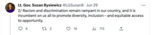 Lt. Gov. Susan Bysiewicz tweeted that “racism and discrimination remain rampant in our country, and it is incumbent on us all to promote diversity, inclusion — and equitable access to opportunity.”