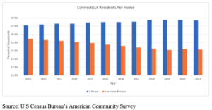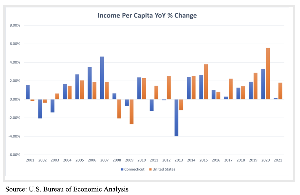CBS News was right in stating that “household income is barely rising.” In fact, one can say that over time, household income has stagnated. Data from the U.S. Census Bureau concludes that the real (accounting for inflation) median household income has only risen 7 percent between the years 2000 to 2021. When viewing the same statistics for Connecticut, the median household income only rose 2 percent. At the same time, both the United States and Connecticut experienced robust real income per capita growth with the former gaining 33 percent and the latter, 22 percent.